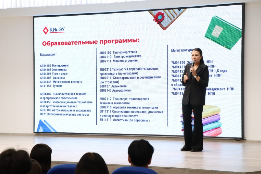 ҚИНЭУ қабылдау комиссиясының басшысы Ж. М. Жұмаш іс — шараның басты міндеті-барлық талантты және ынталы білім алушылар үшін оқытуды қолжетімді ету екенін айтты. Ол әр студент өзінің оқу және шығармашылық жоспарларын сәтті жүзеге асыра алуы керек екенін атап өтті. Ол қатысушыларды ЖОО-ның білім беру бағдарламаларымен таныстырды және болашақ түлектердің назарын студенттерді әлеуметтік қолдау туралы Ережеге сәйкес ҚИНЭУ ұсынатын гранттар мен жеңілдіктердің кең ауқымына аударды.